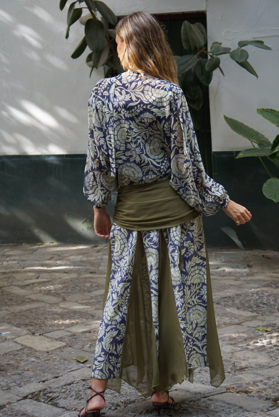 Chaqueta corta. Manga abullonada. Puño con cierre de botón. Corbata ajustable. Estampado cashemire en tonos lavanda y verde. Talla única.