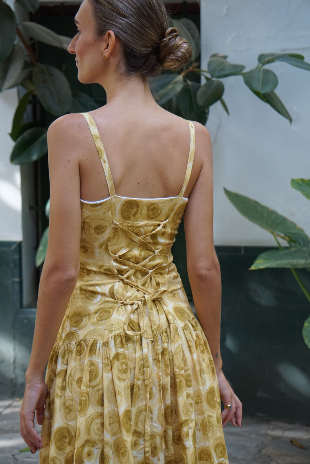 Vestido largo. Escote bustier drapeado con tirante. Diseño ceñido ajustable mediante corpiño. Corte semicircular en la cadera . Cremallera invisible lateral. Estampado circular amarillo. 80% lino. 20% algodón.