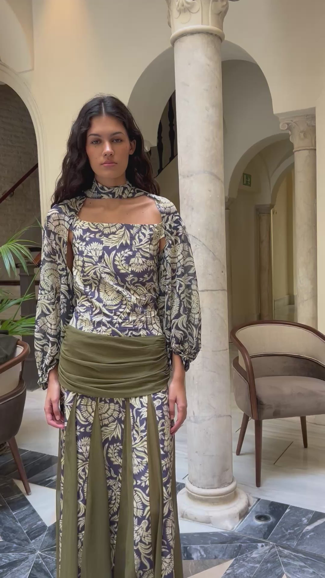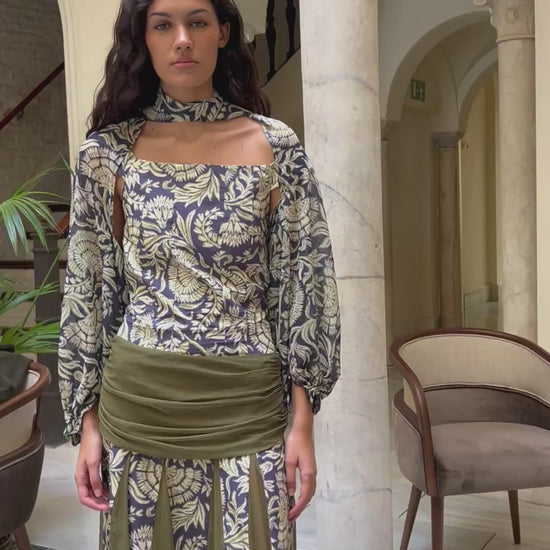 Chaqueta corta. Manga abullonada. Puño con cierre de botón. Corbata ajustable. Estampado cashemire en tonos lavanda y verde. Talla única.