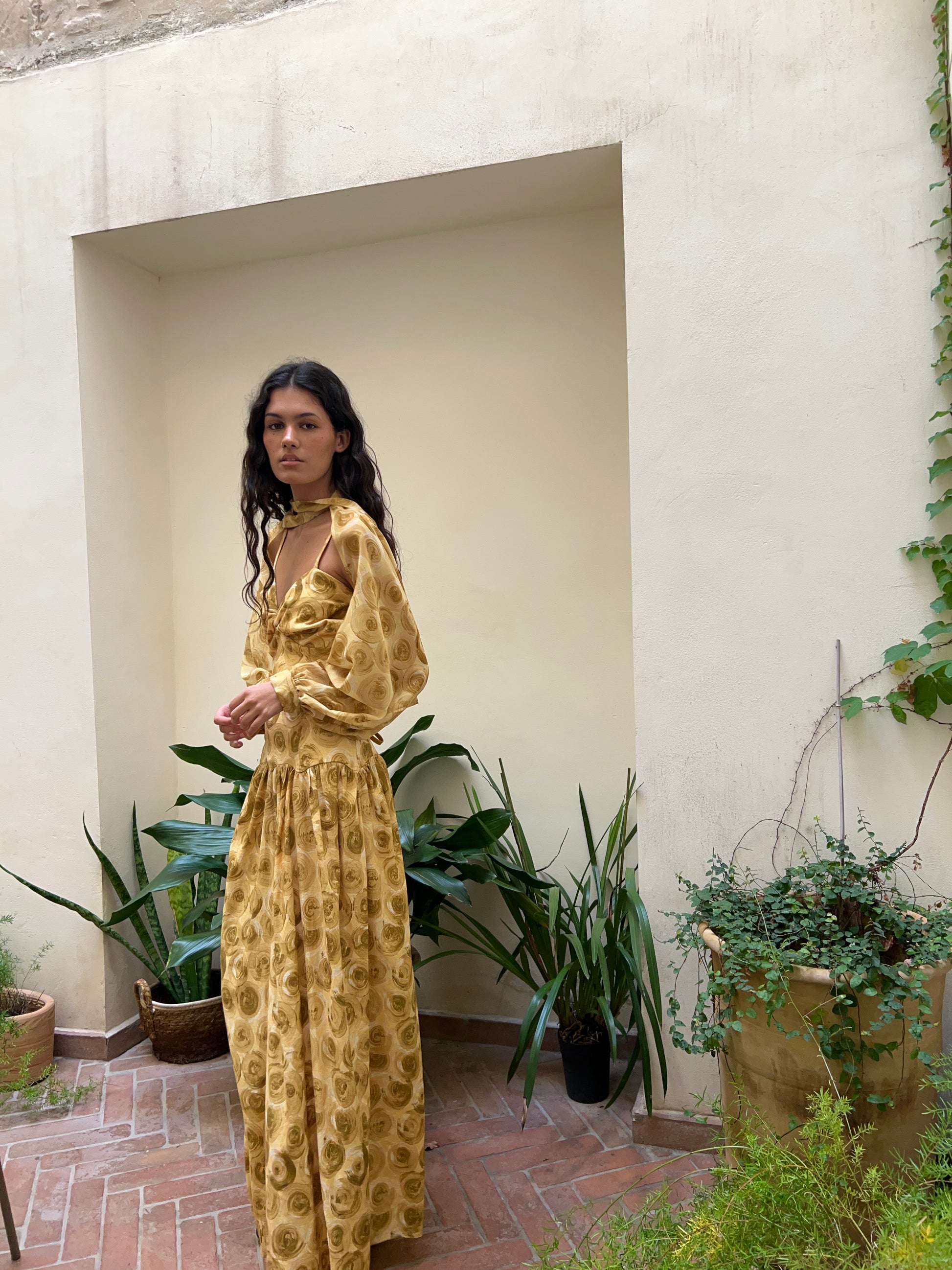 Chaqueta corta. Manga abullonada. Puño con cierre de botón. Corbata ajustable. Estampado circular amarillo en gasa. Talla única.
