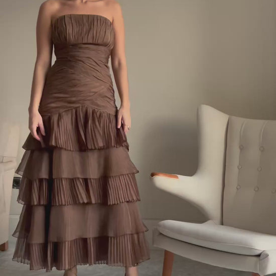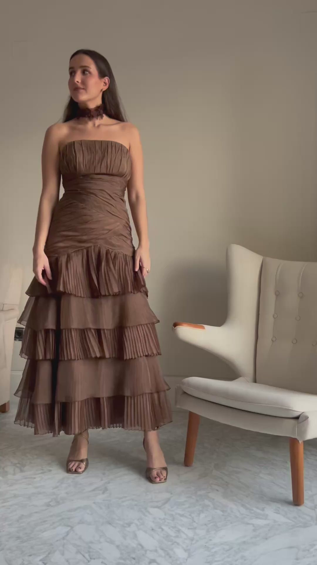 Vestido largo. Escote palabra de honor. Corte ajustado hasta la cadera. Combinación de volantes plisados y lisos. Cremallera invisible trasera. Organza marrón.