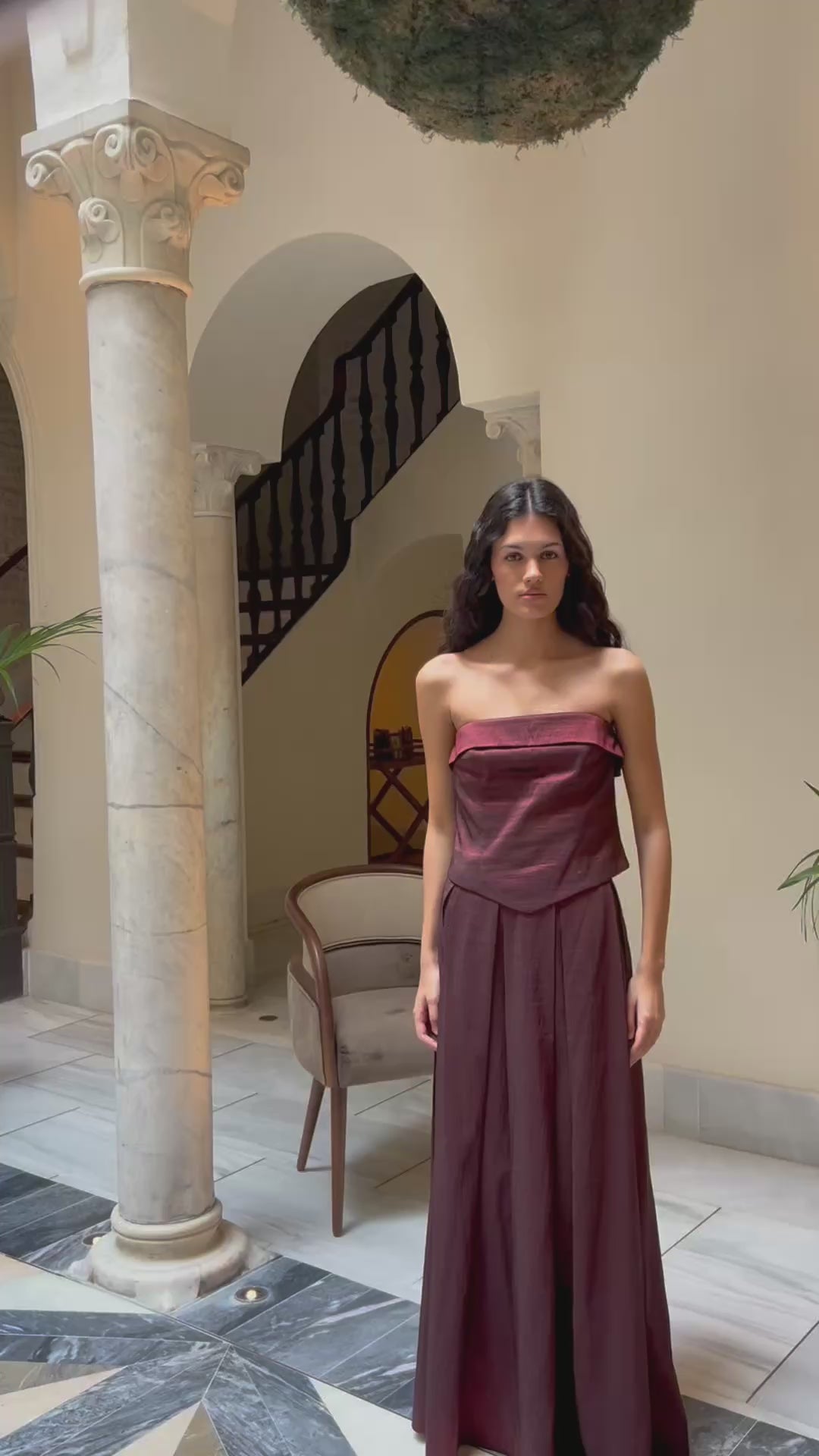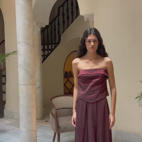 Look dos piezas. Top palabra de honor con solapa en el escote. Bajo en pico. Falda con tablas. Cremallera invisible. Tejido salvaje