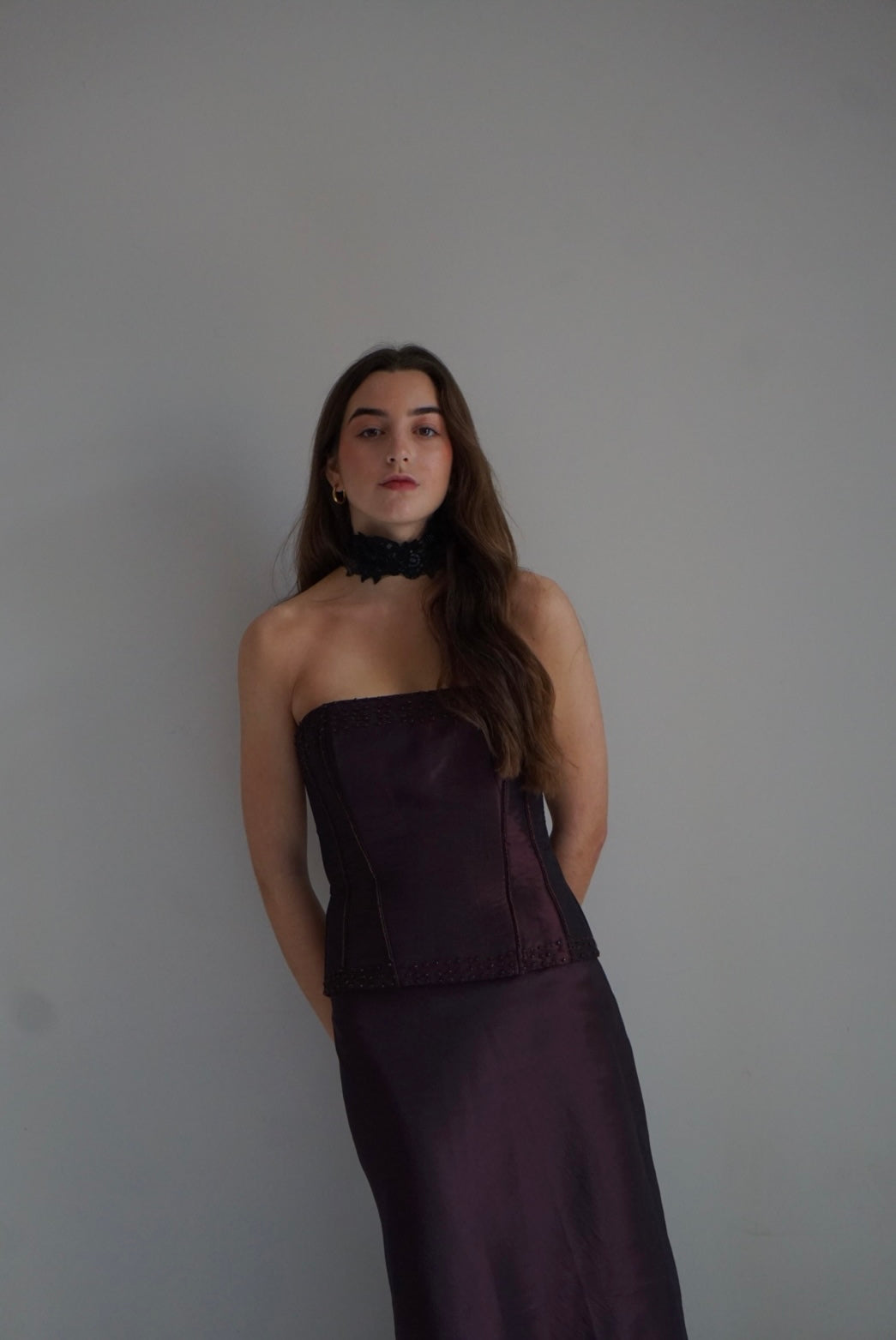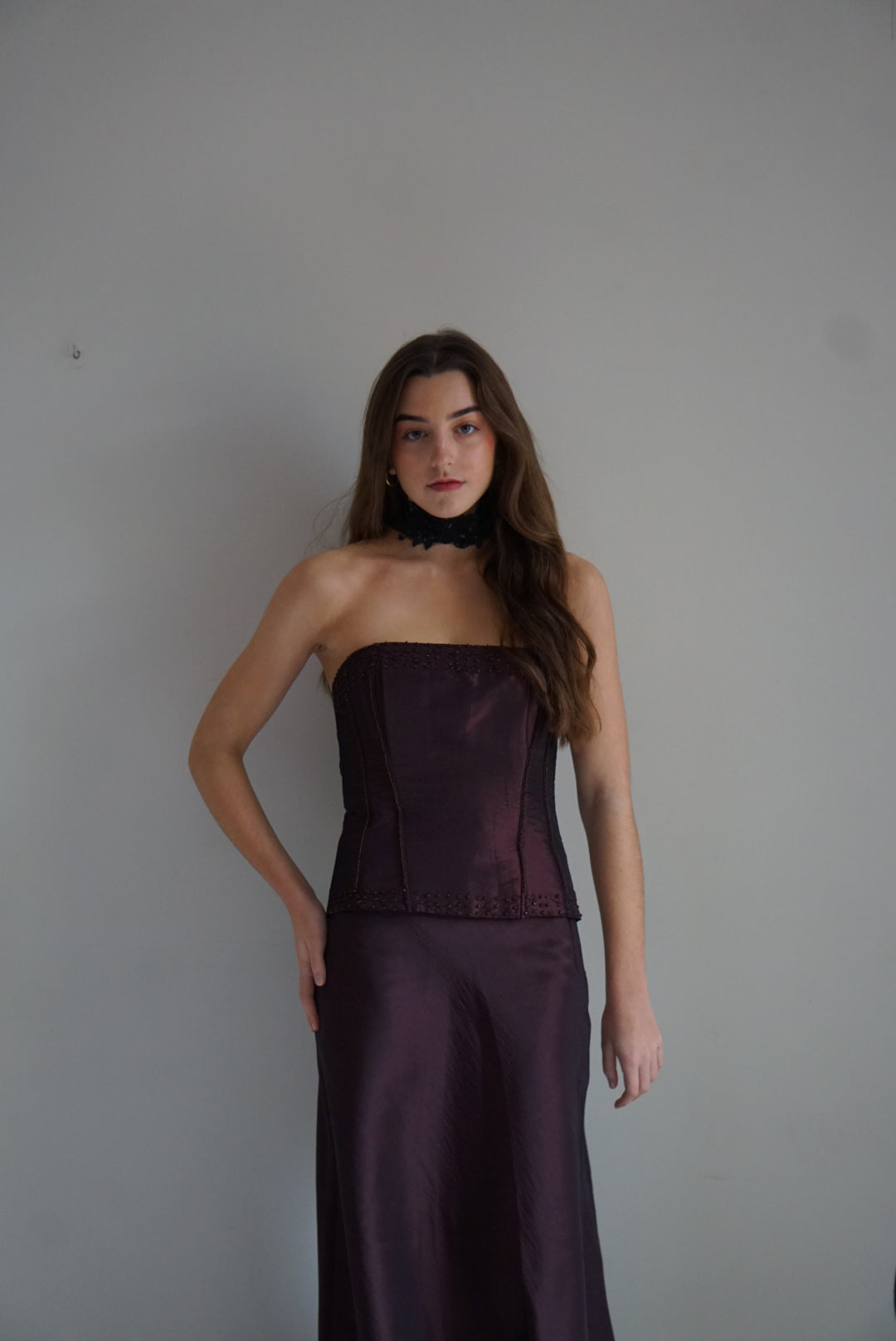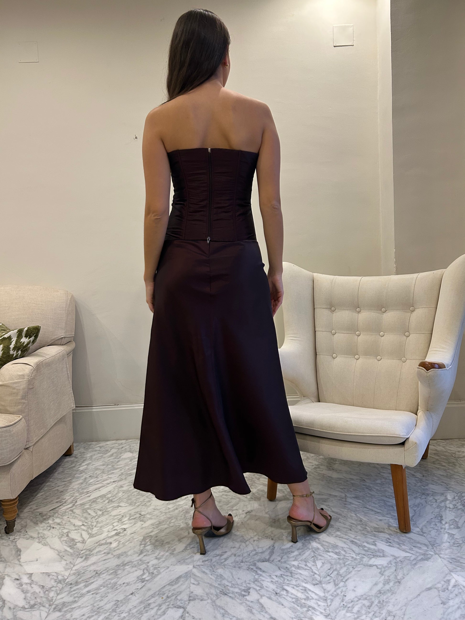 Look dos piezas. Top palabra de honor en tejido salvaje bourdeos con pedrería. Cierre con cremallera. Ballenas interiores. Falda larga con vuelo. Cierre falda con cremallera invisible.
