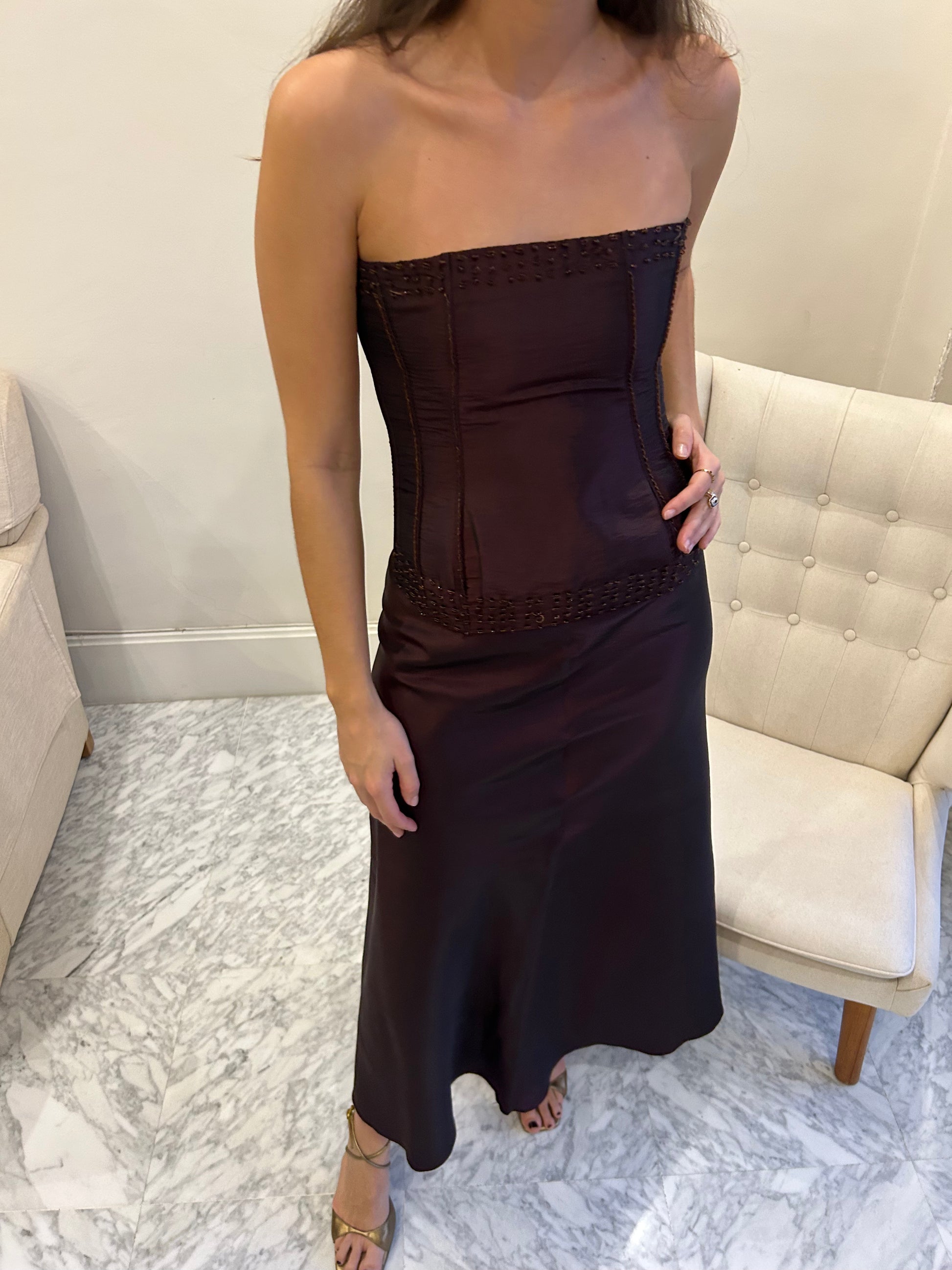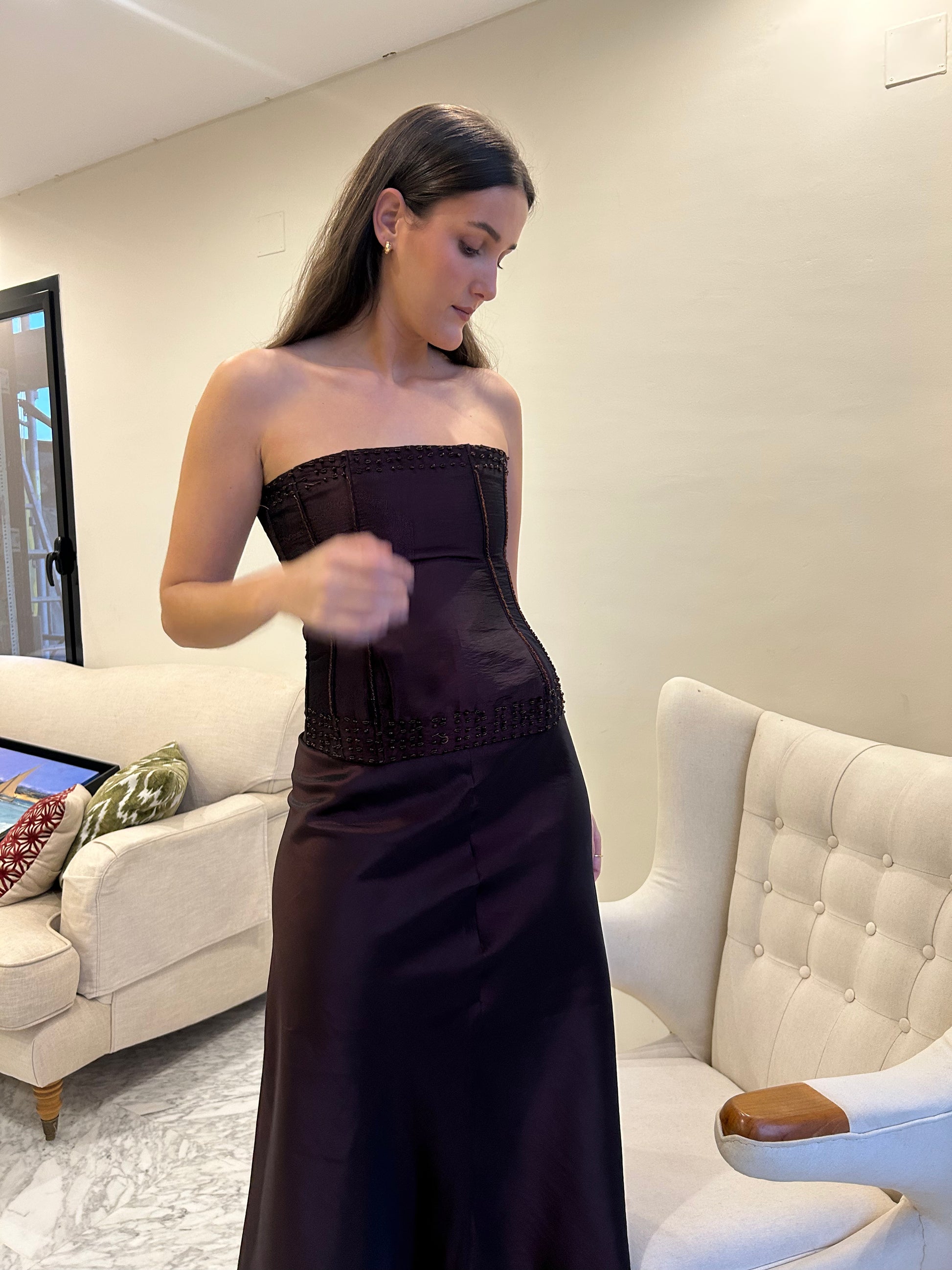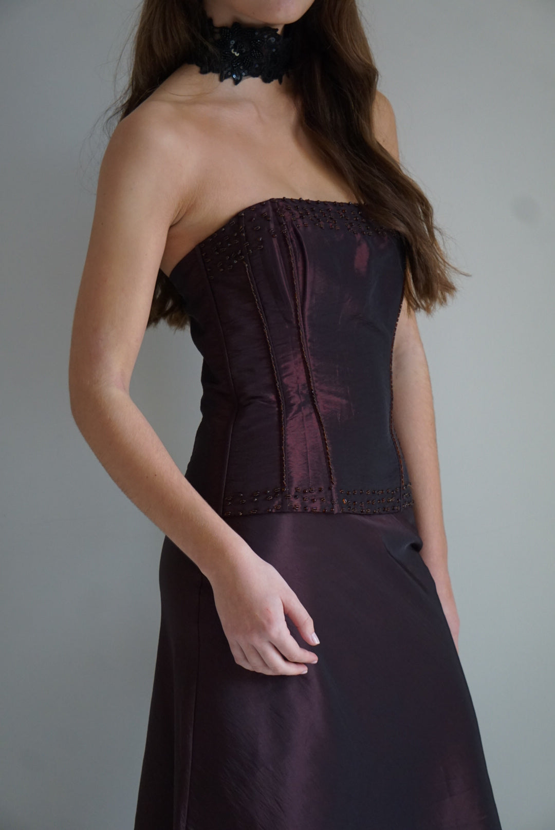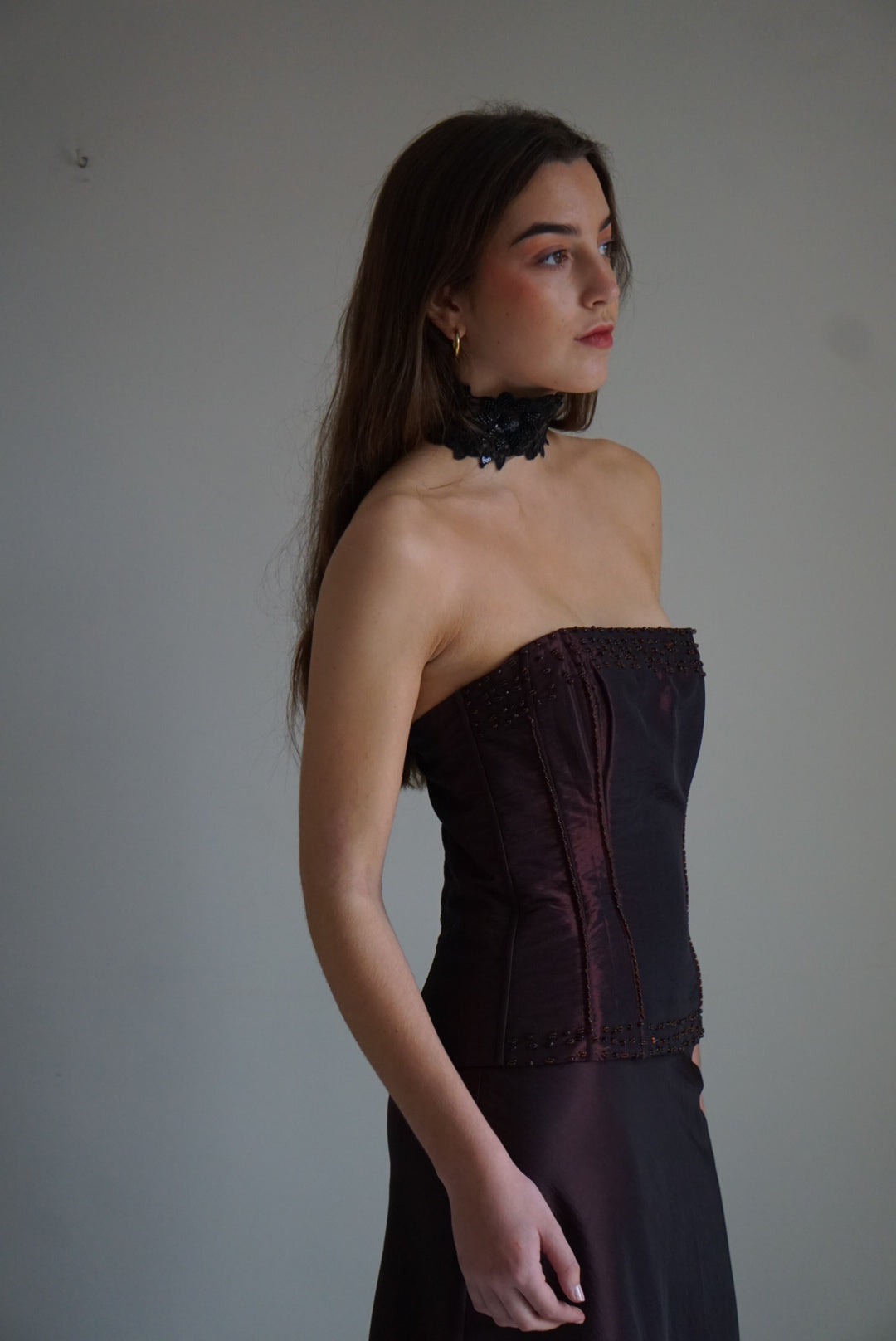 Look dos piezas. Top palabra de honor en tejido salvaje bourdeos con pedrería. Cierre con cremallera. Ballenas interiores. Falda larga con vuelo. Cierre falda con cremallera invisible.